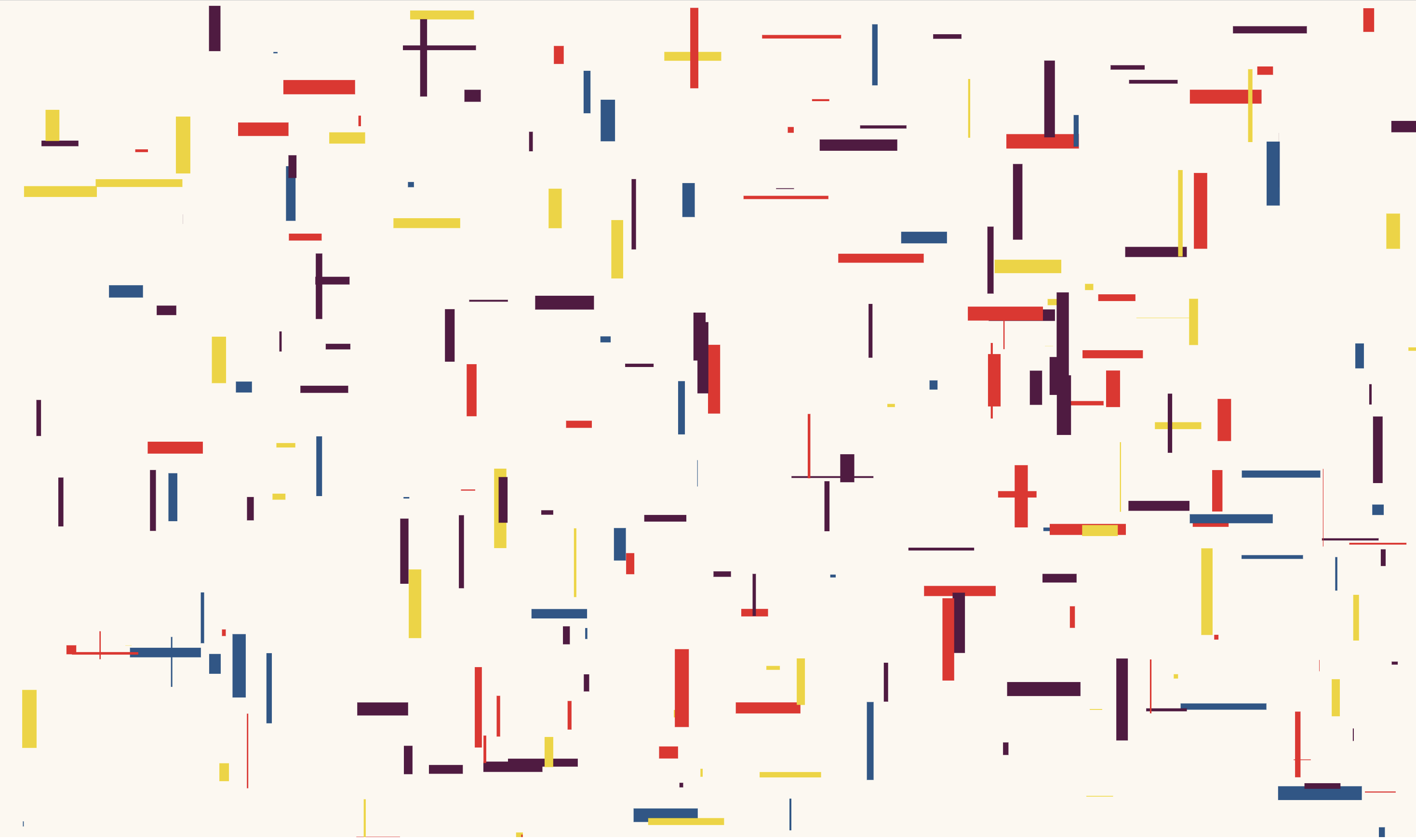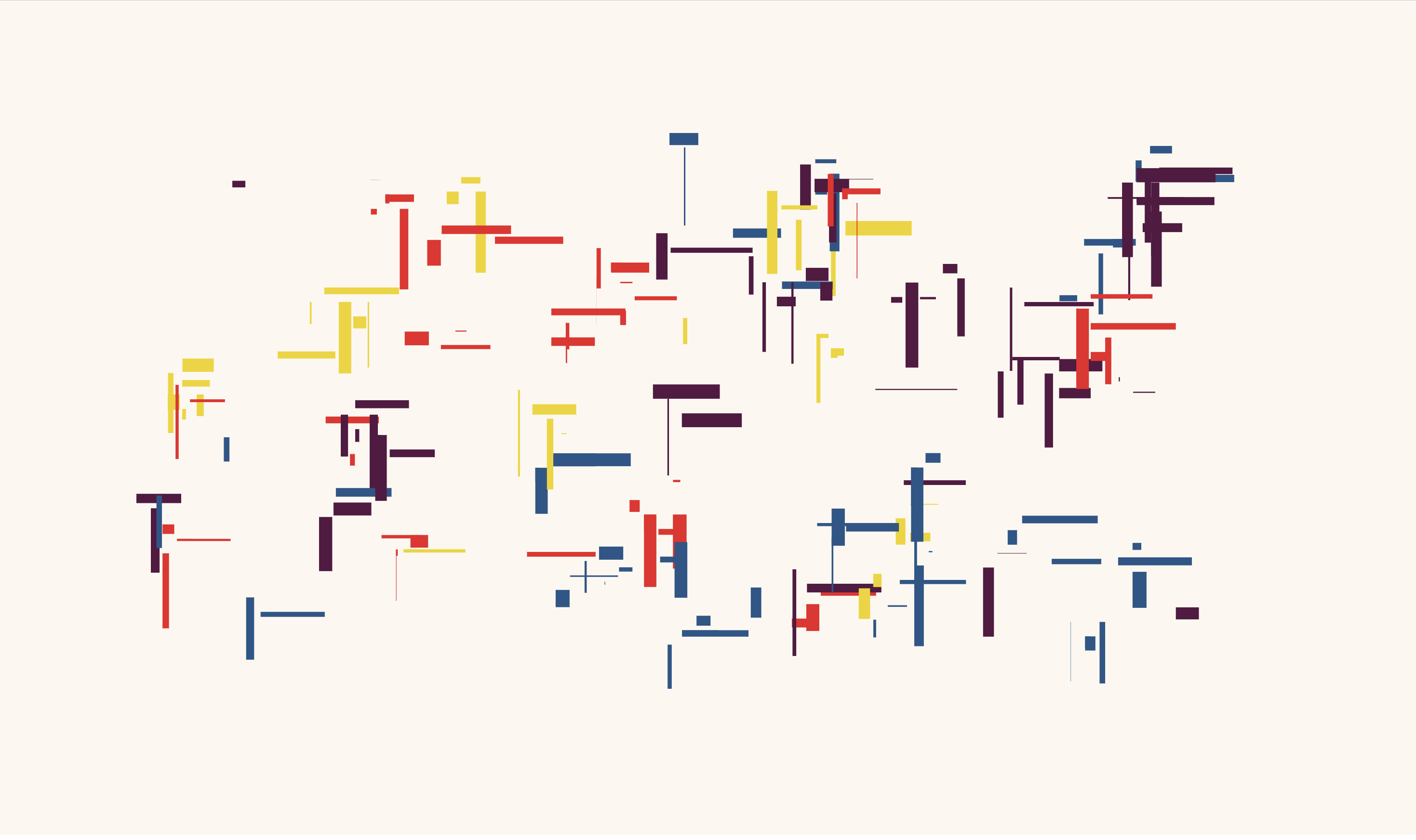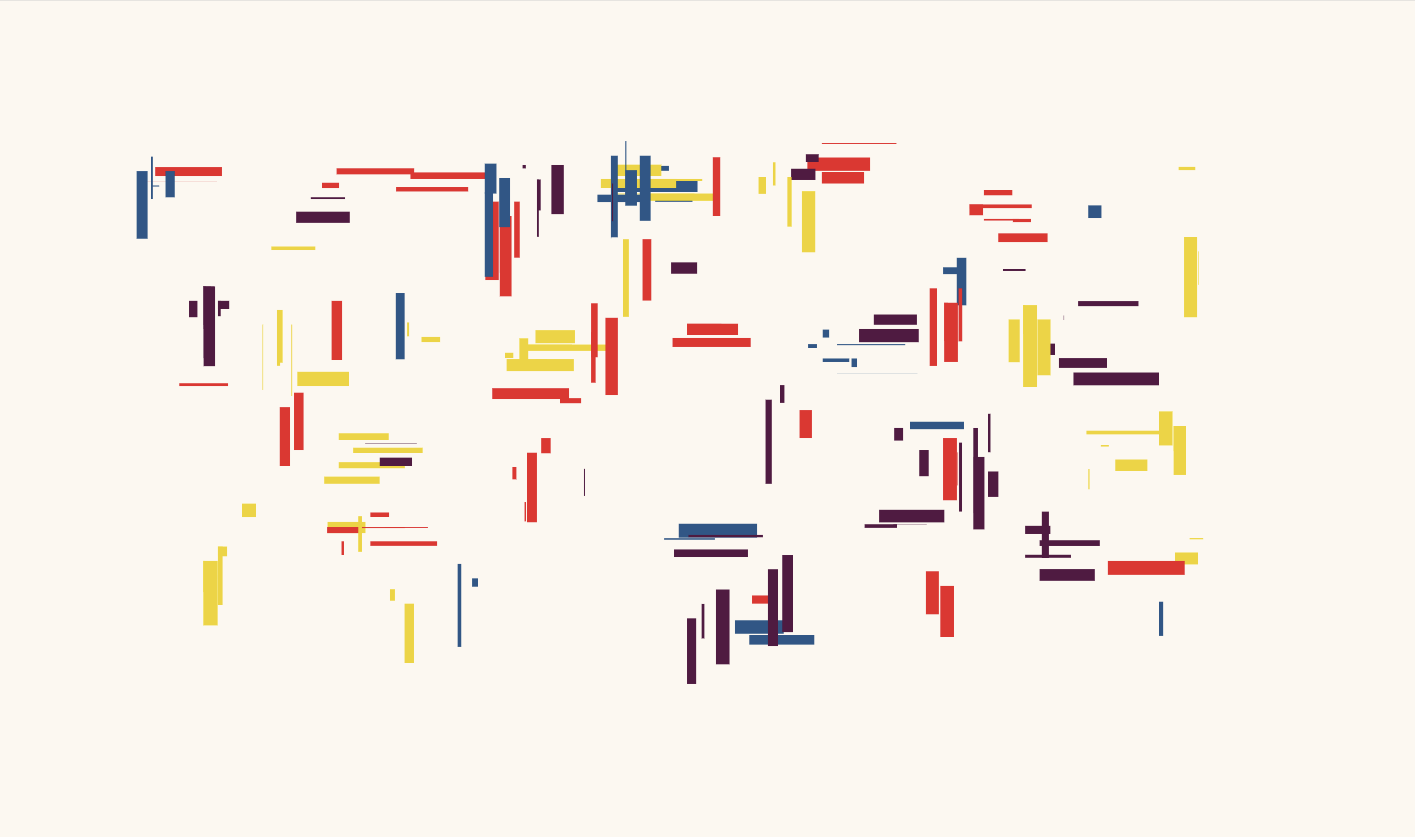 The code worked off of simple parameters: How many shapes to create, probability to create child shapes, and margins to generate the shapes within. Put together, the code generates unique clusters of rectangles building off one another to create an appealling composition and use of space. A user can also press 'Spacebar' to generate a new design until the composition is to the user's liking.